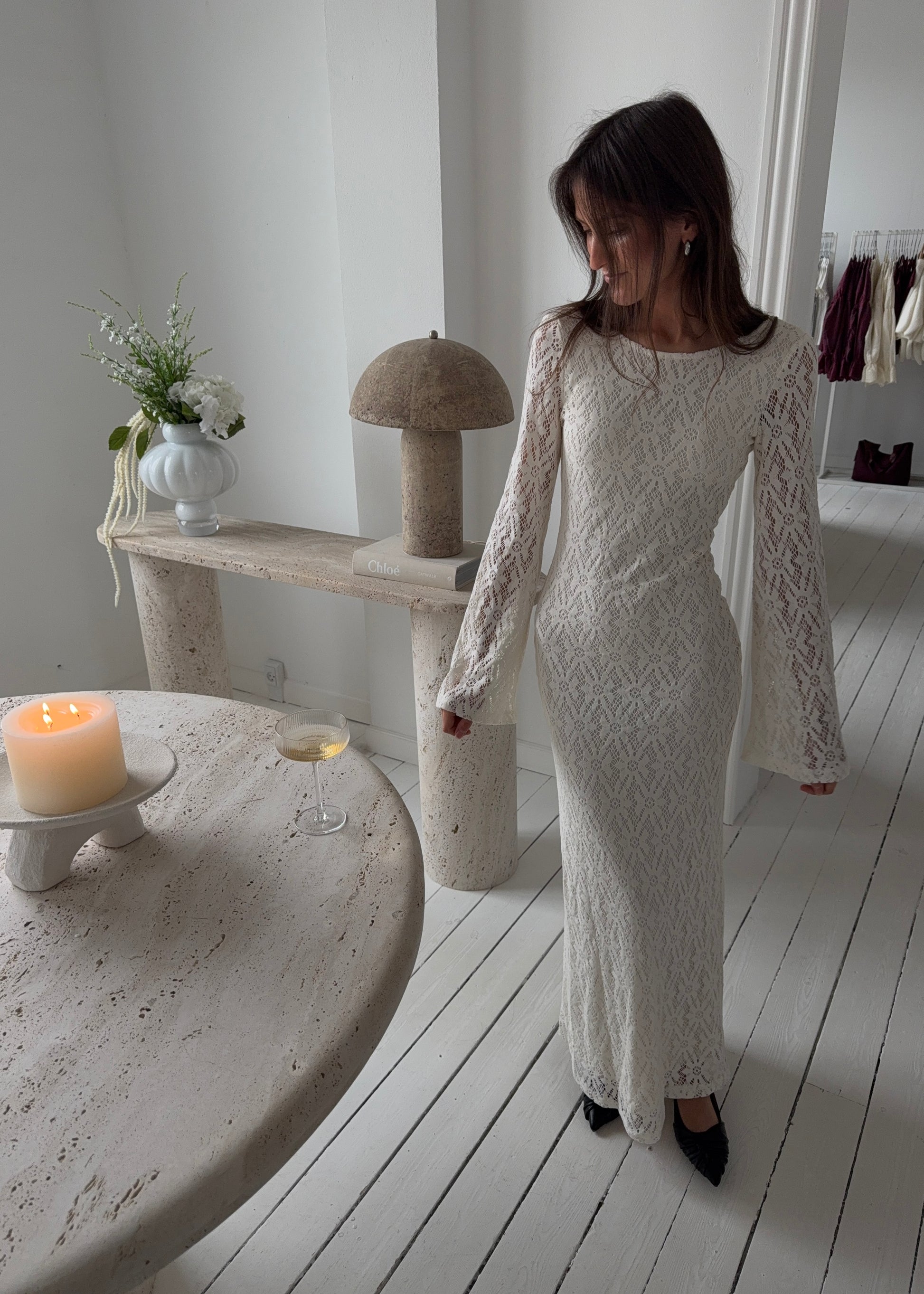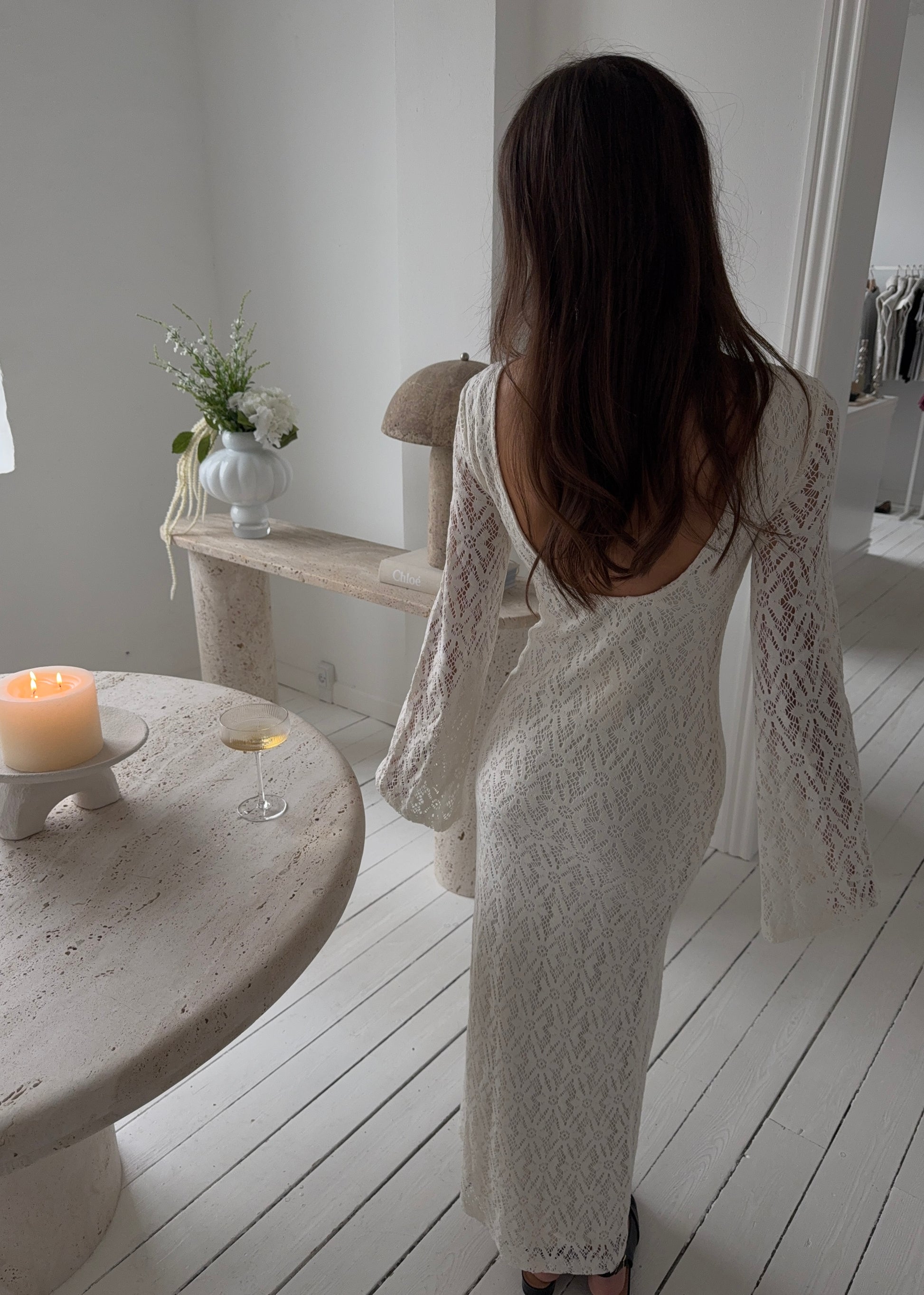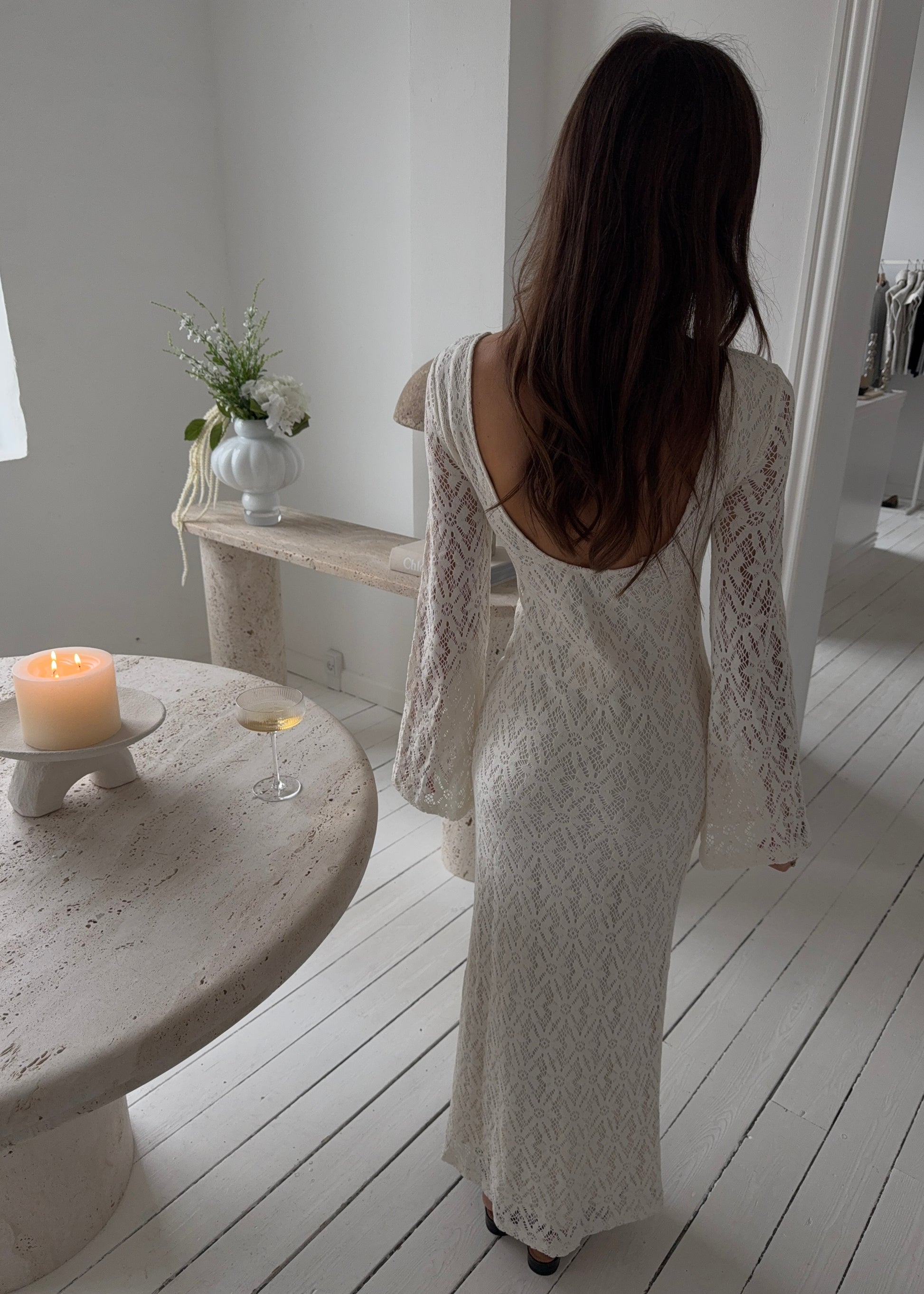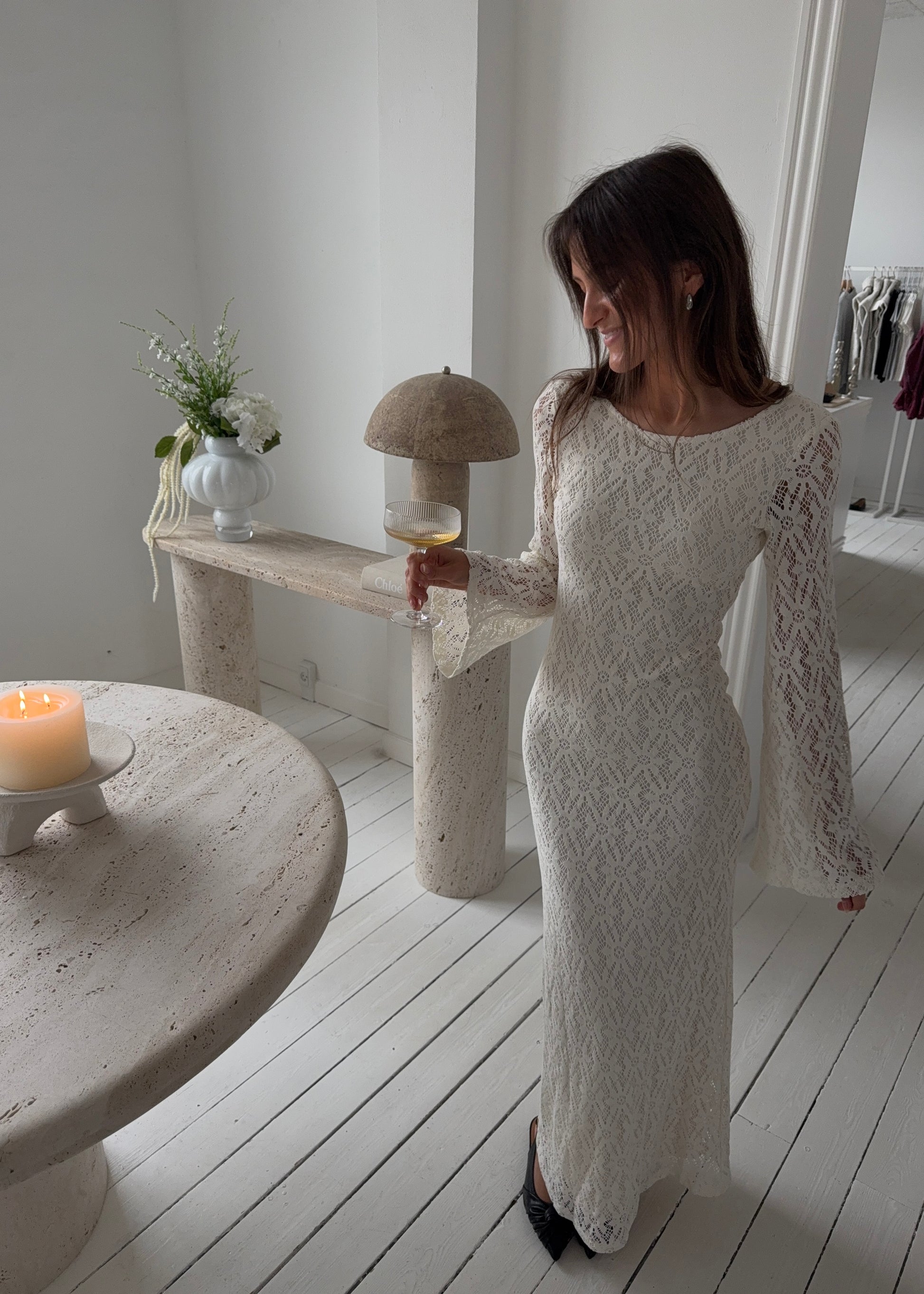 Vores BLONDE KJOLE i det smukkeste blonde materiale, og fine detaljer ved ærmerne og den dybe udskæring på ryggen.