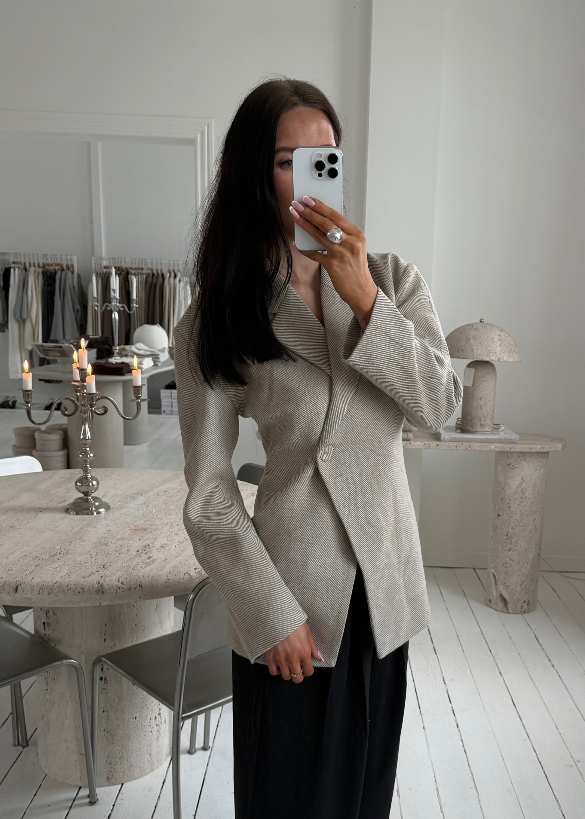 Vores fine COCO BLAZER i beige. Blazeren går ind i taljen og lukkes med en knap.