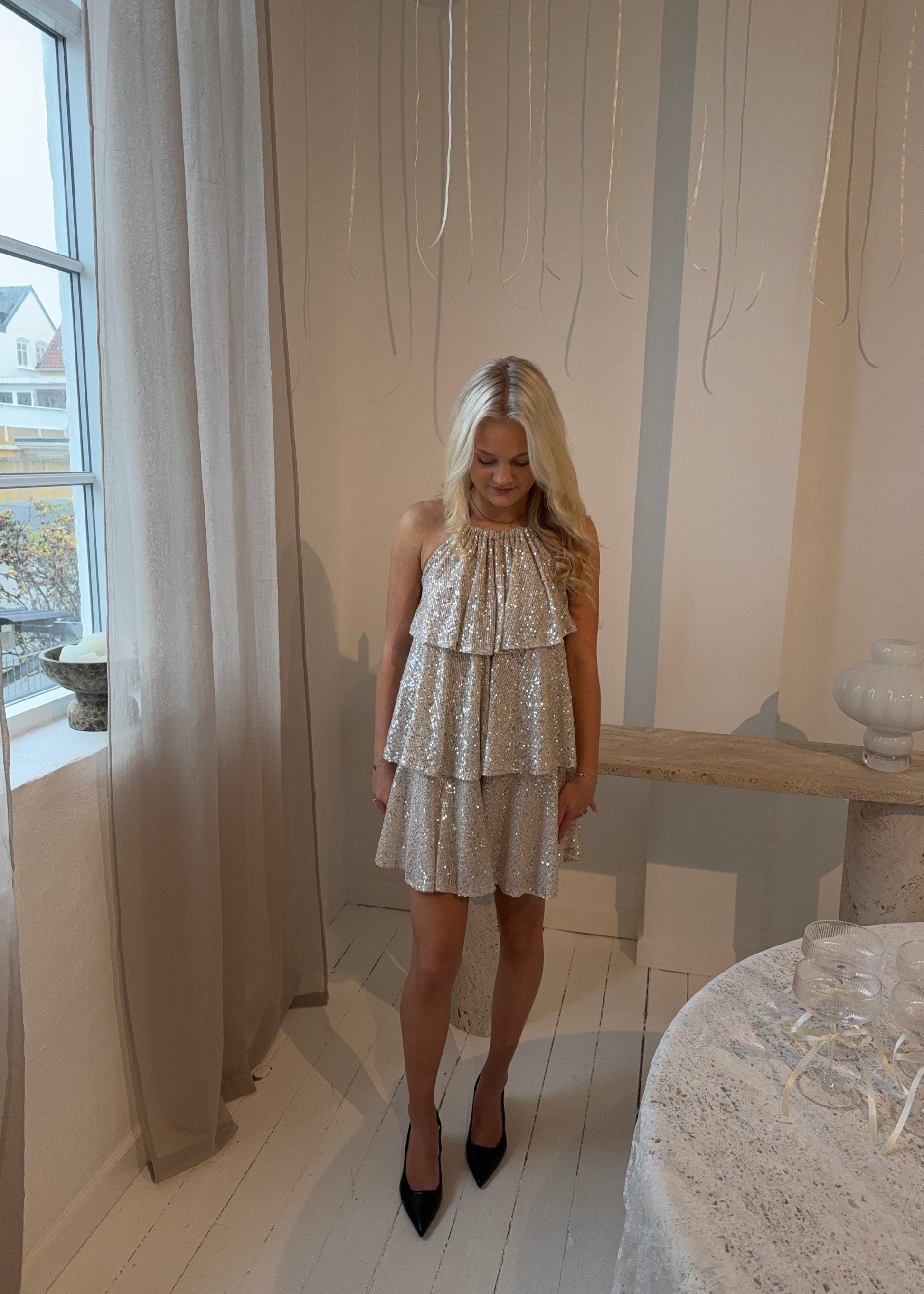Vores smukke ELLIE DRESS i den fineste beige farve. Kjolen har palietter og lukkes med en en sløjfe.