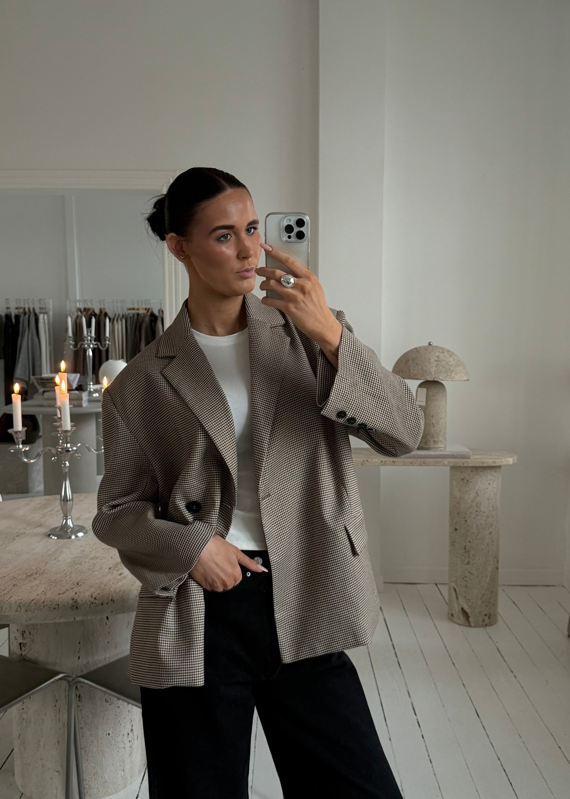 Vores fine EMILY BLAZER i brun i et flot ternet materiale. Blazeren lukkes med en knap.