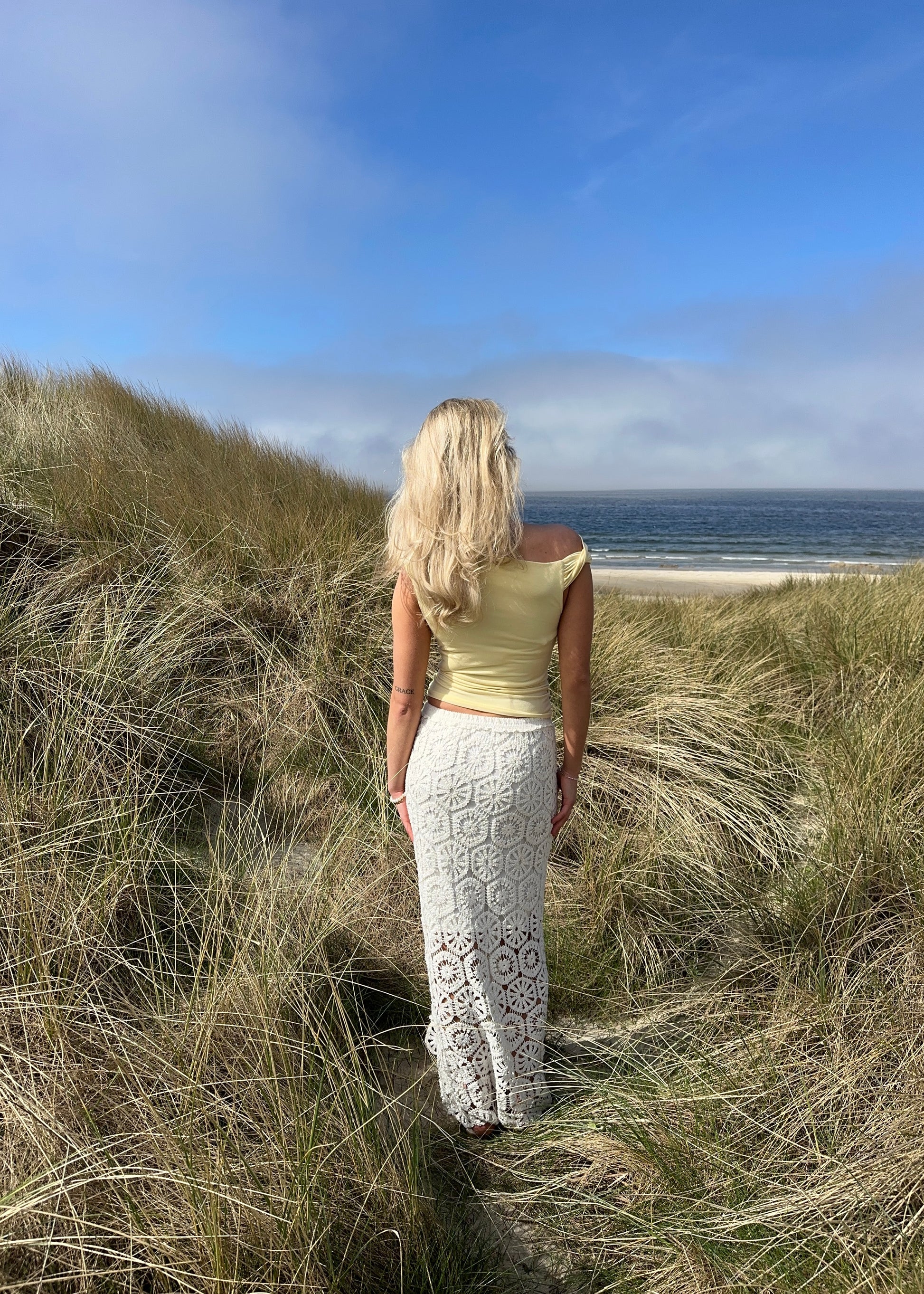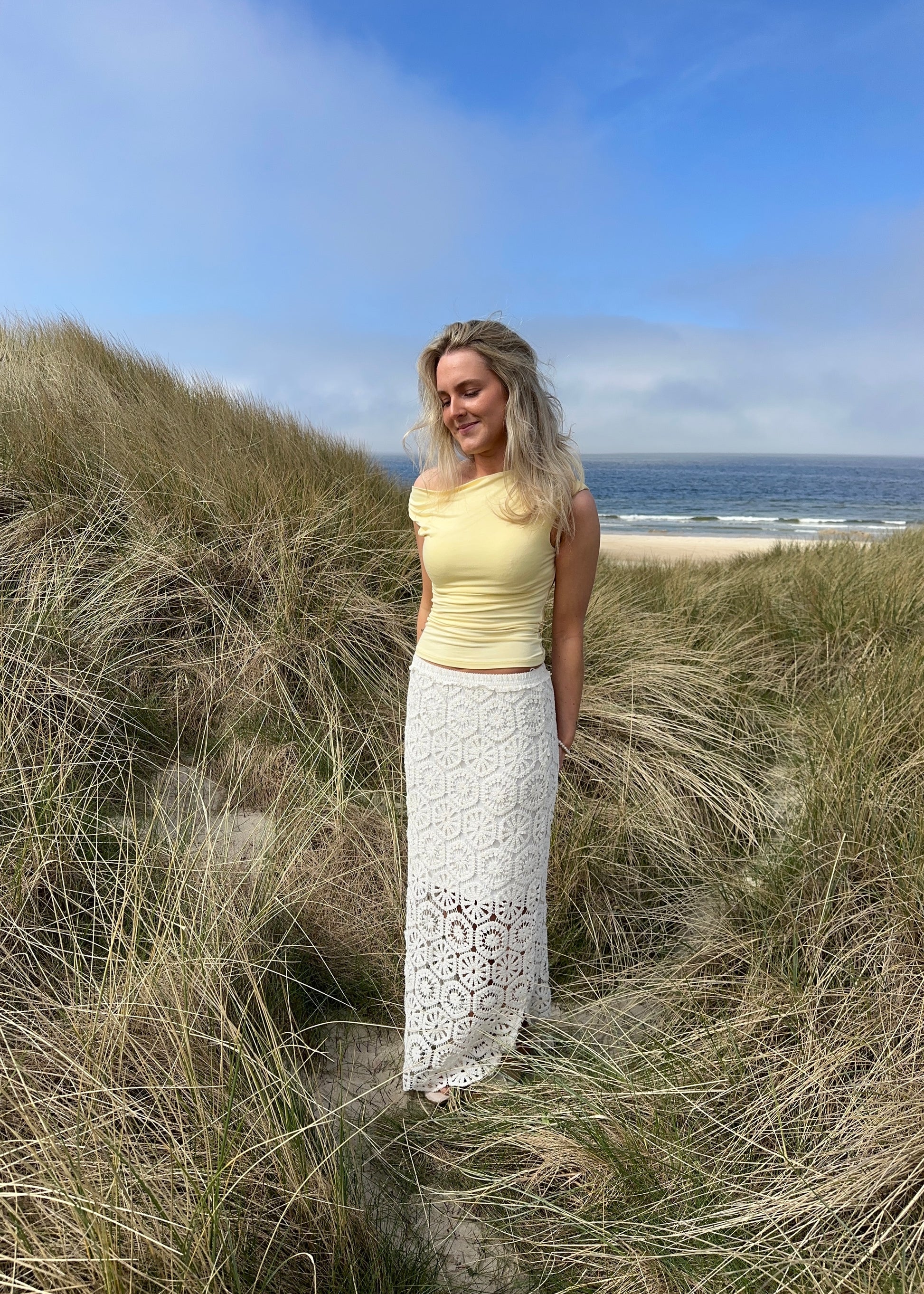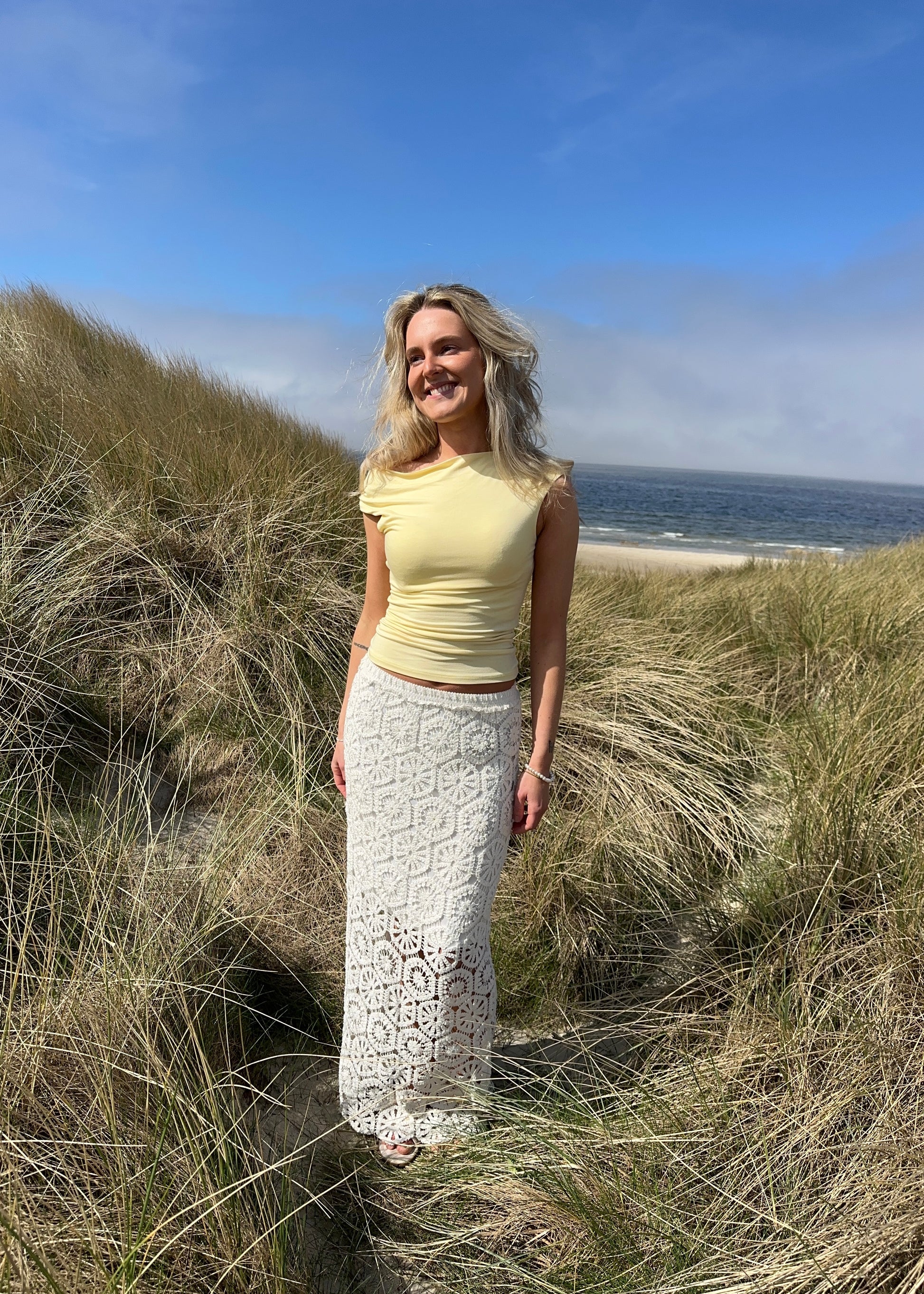 Vores hæklet nederdel er en maxi nederdel i hæklet materiale. Der er elastikbånd i taljen & underkjole så nederdelen ikke er gennemsigtig.