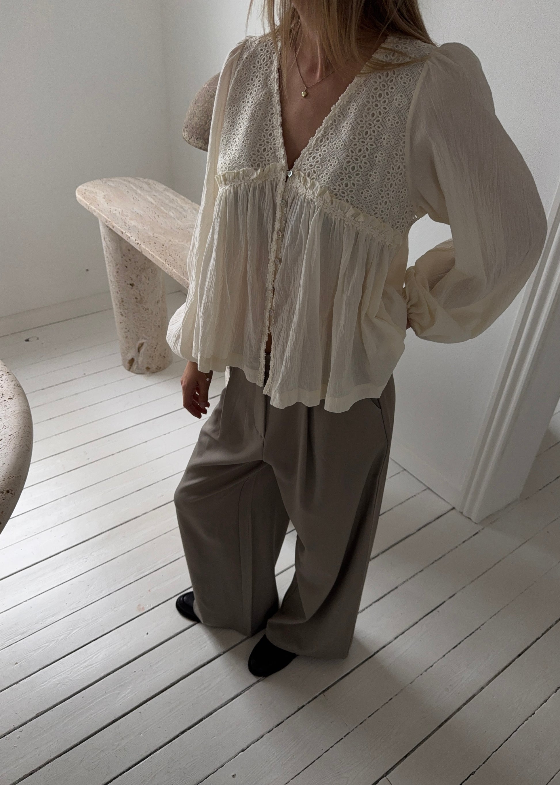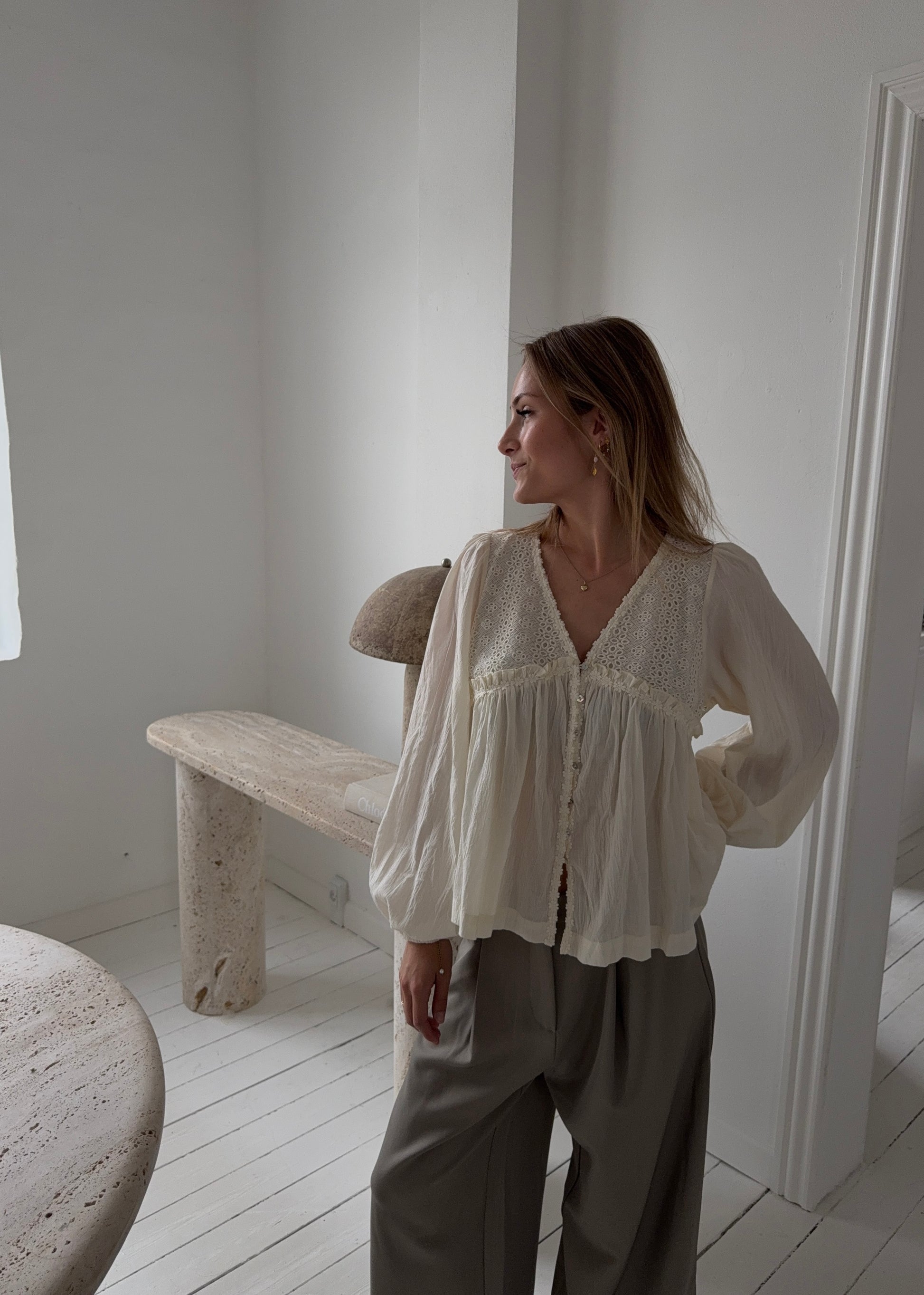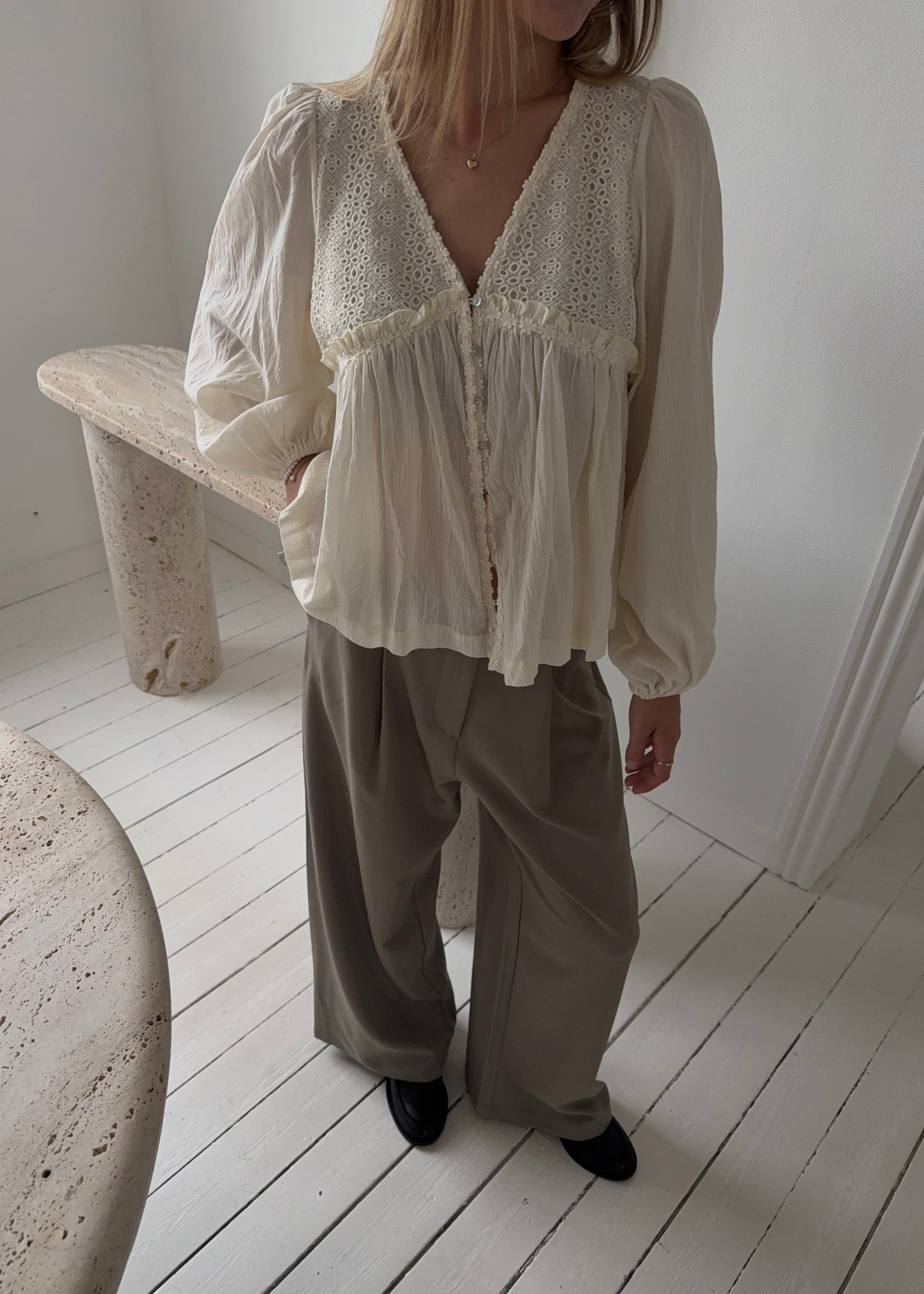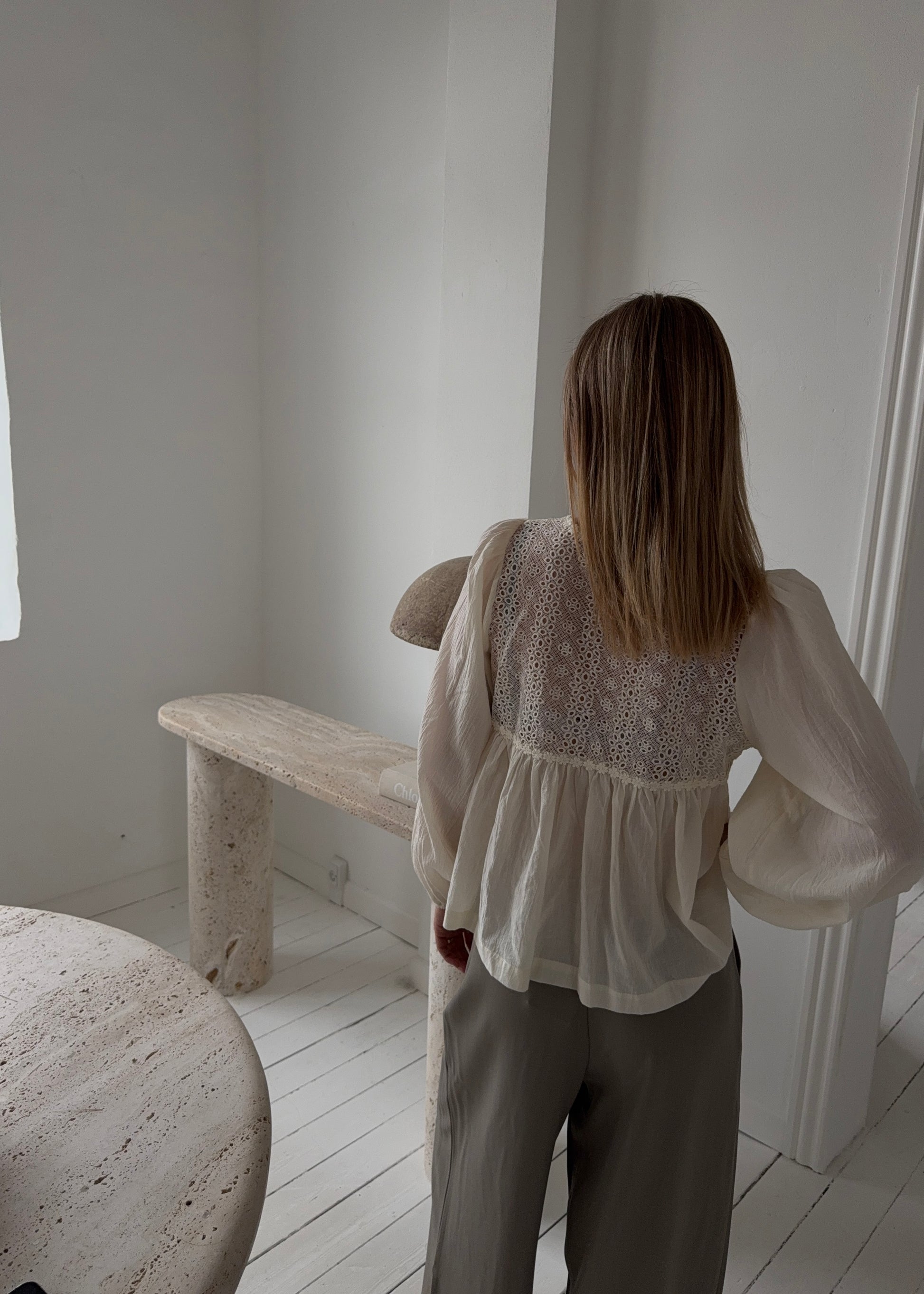 Vores MAGDA SKJORTE er den perfekte skjorte til en fin anledning. Skjorten har det flotte blondemateriale henover brystet og bagpå ryggen, og knapper hele vejen ned foran.