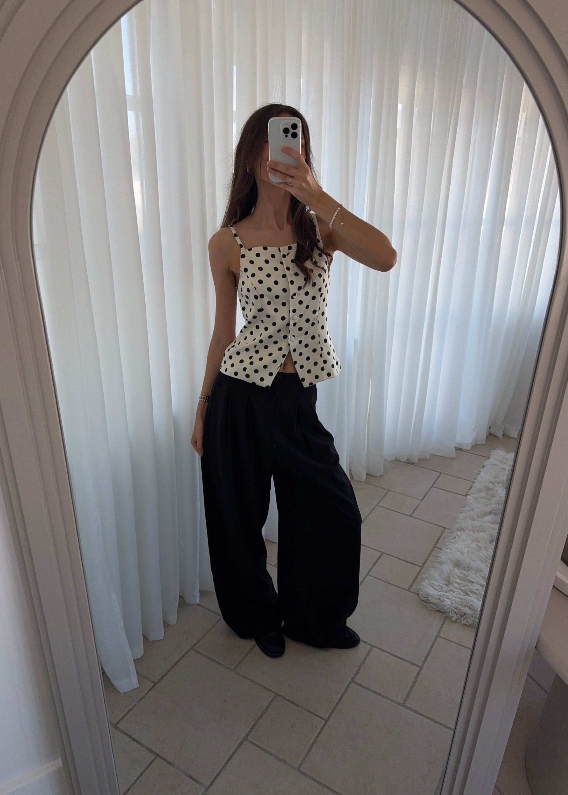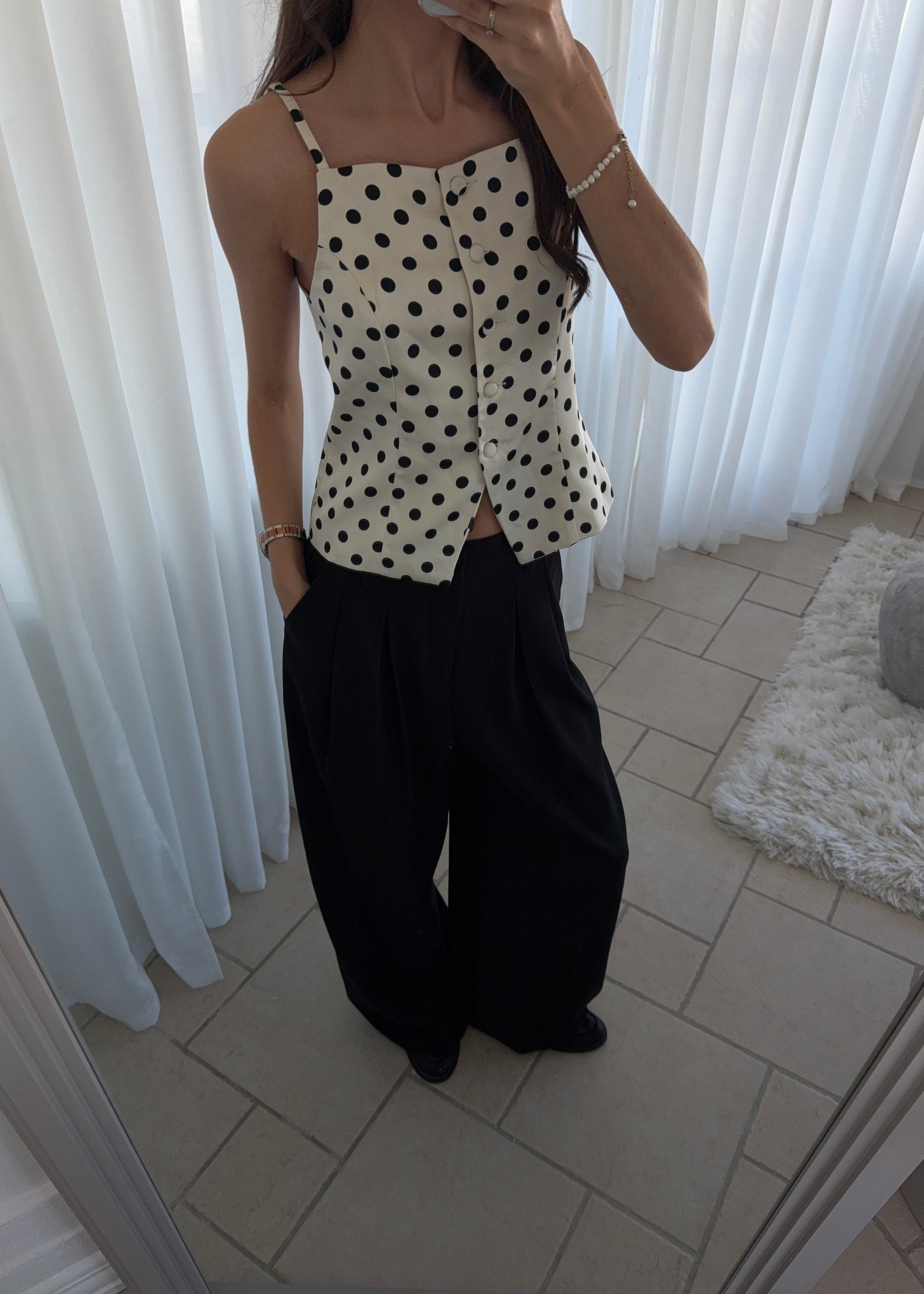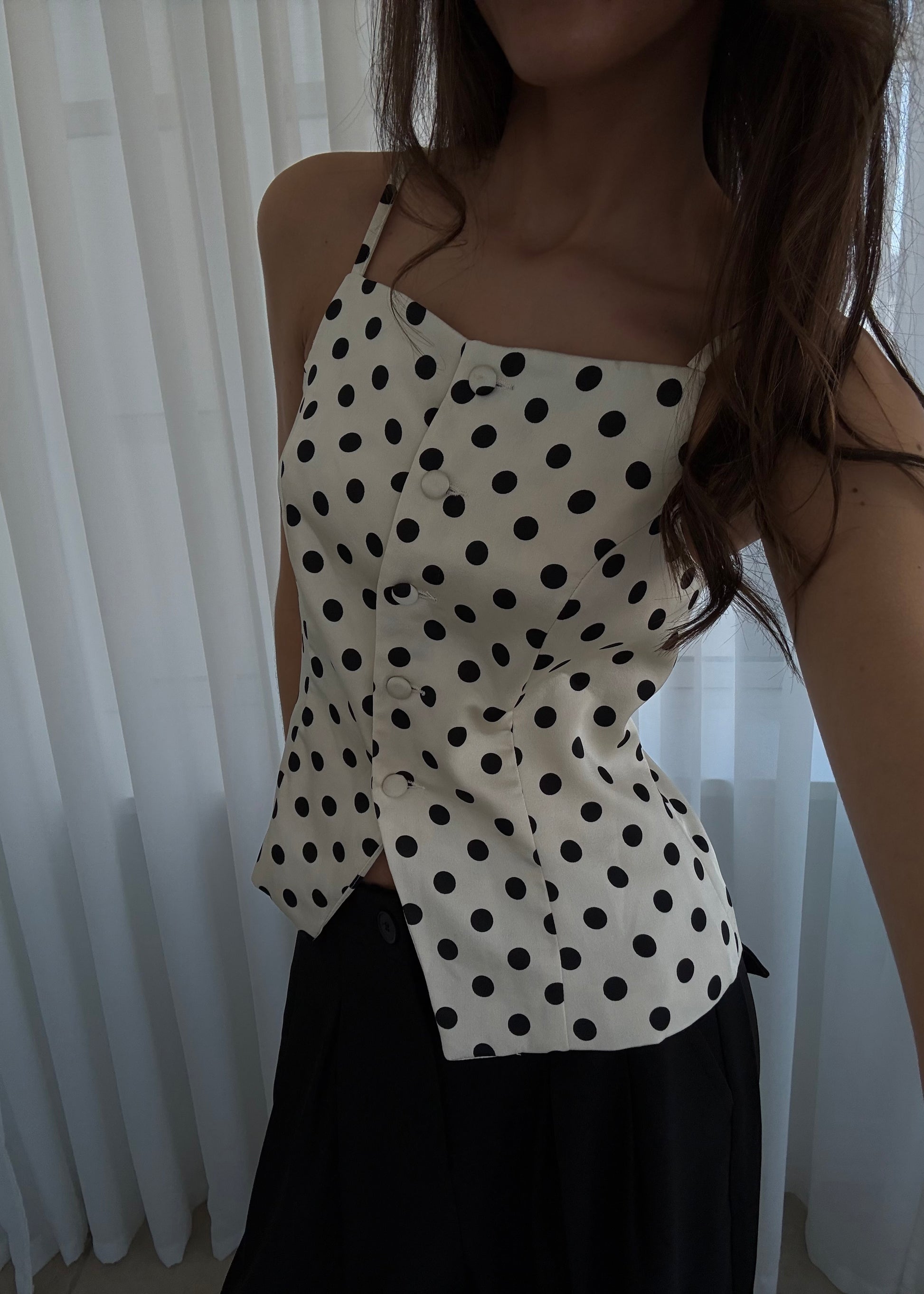 Vores smukke PHILINE TOP med polkaprikker. Toppen har et flot snit og har knapper foran.