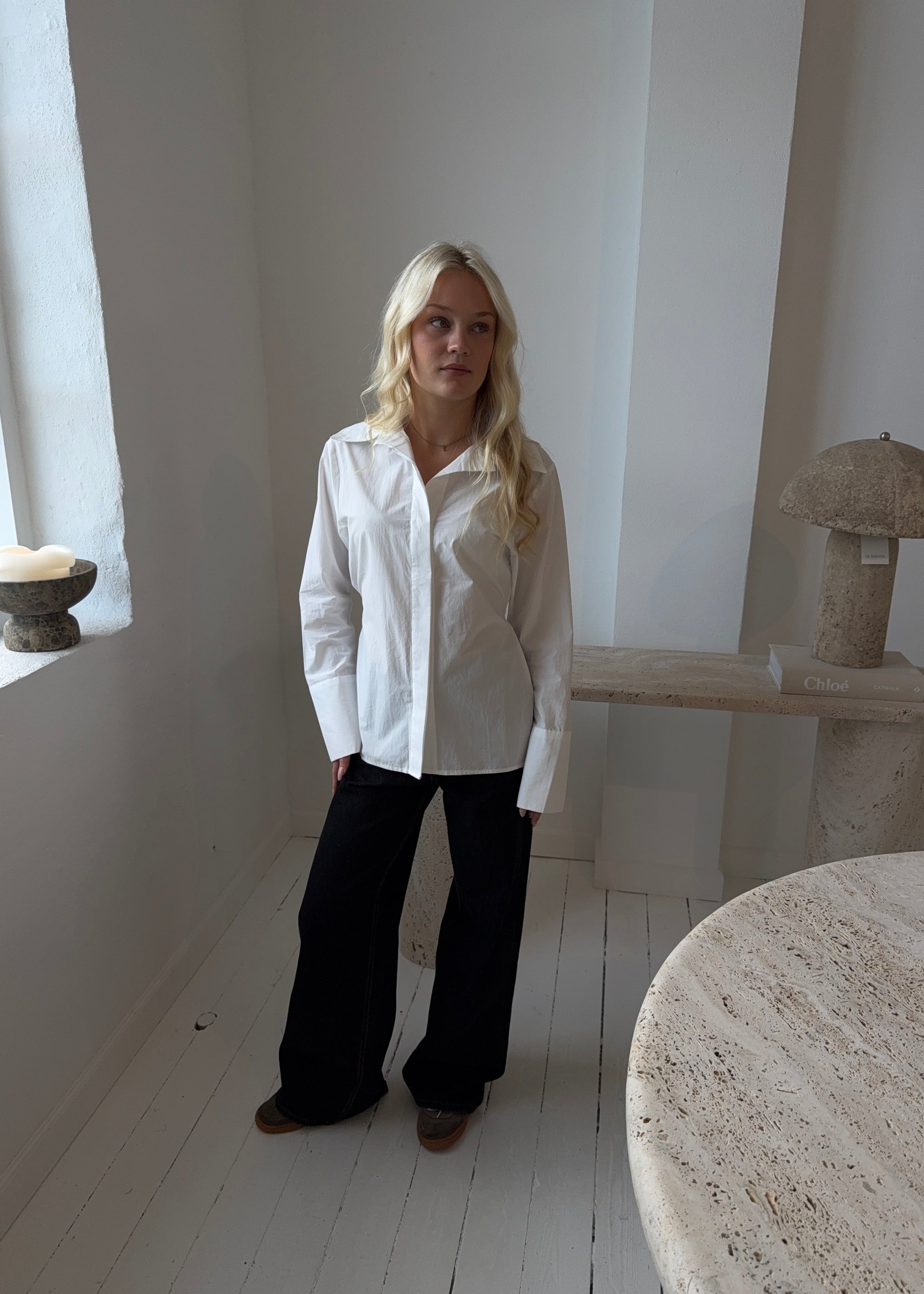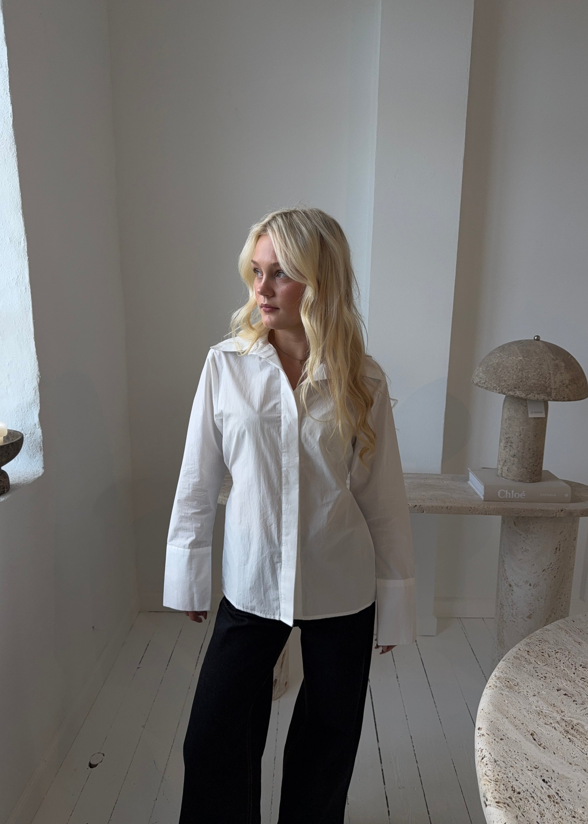 Vores smukke Rosa Fitted Shirt i hvid, som bindes bagpå i taljen og ærmerne på skjorten er brede.