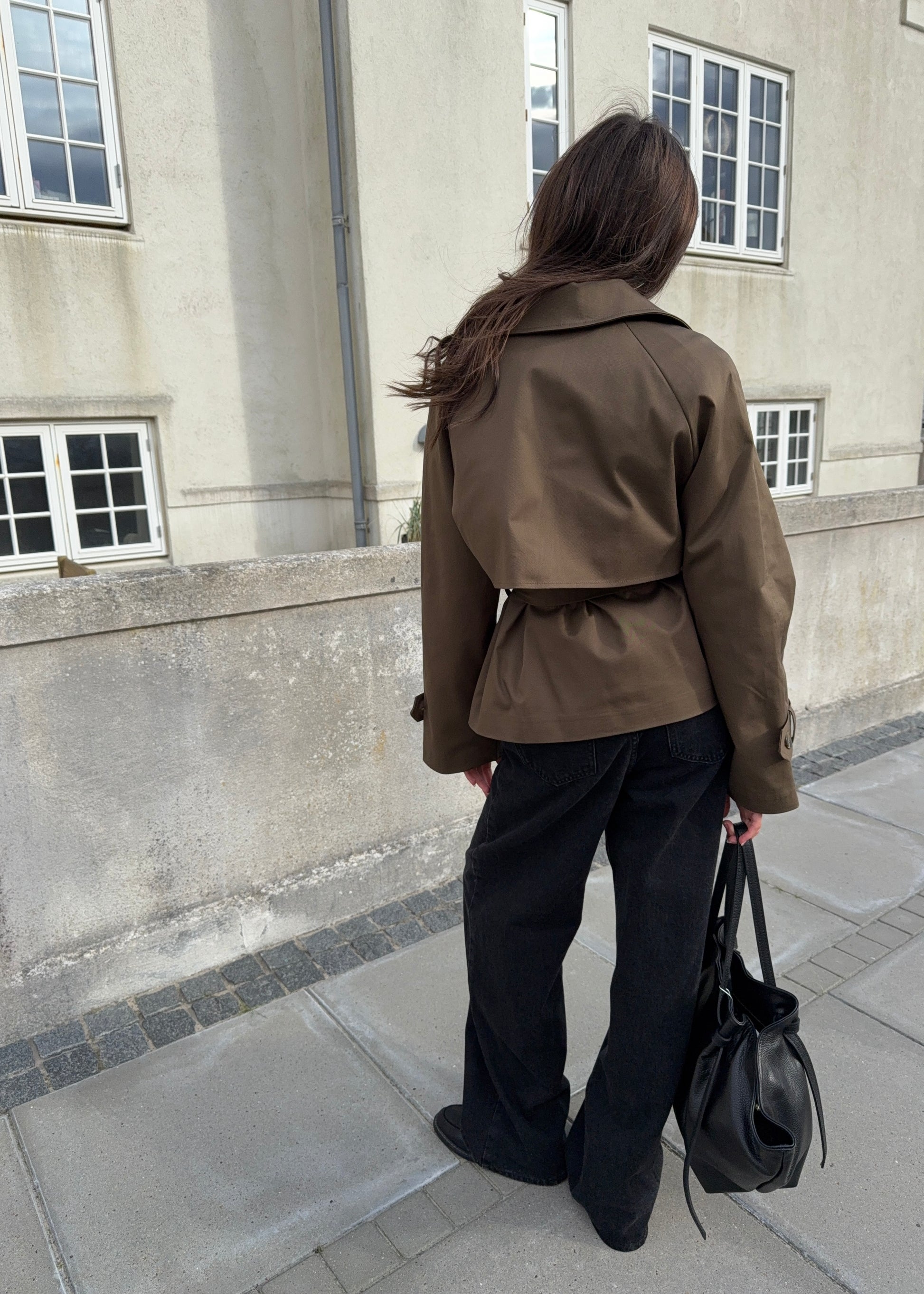Vores fine Short-MAGDA Trenchcoat med flotte detaljer både foran og bagpå. Jakken har bindebånd som kan tages af.