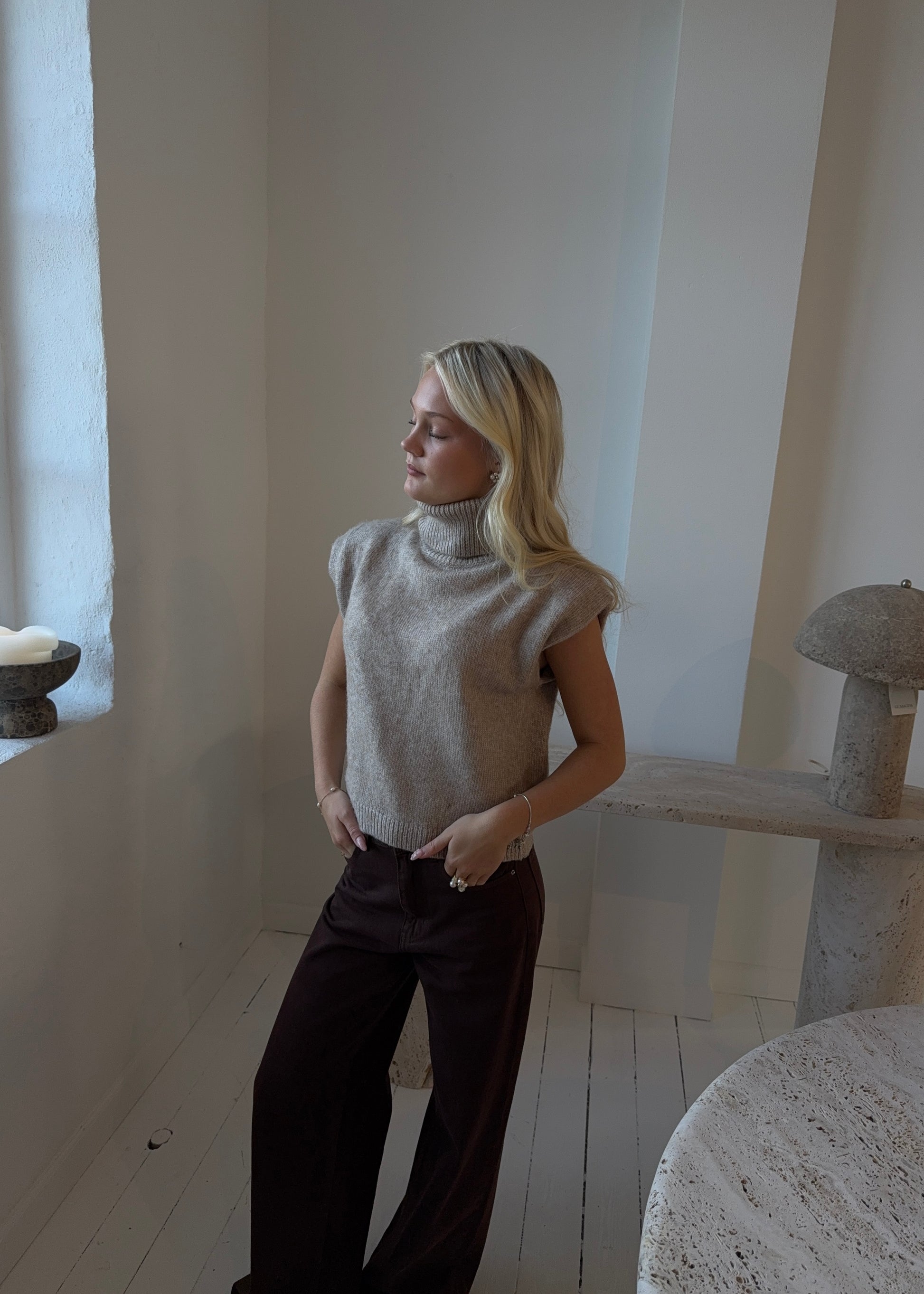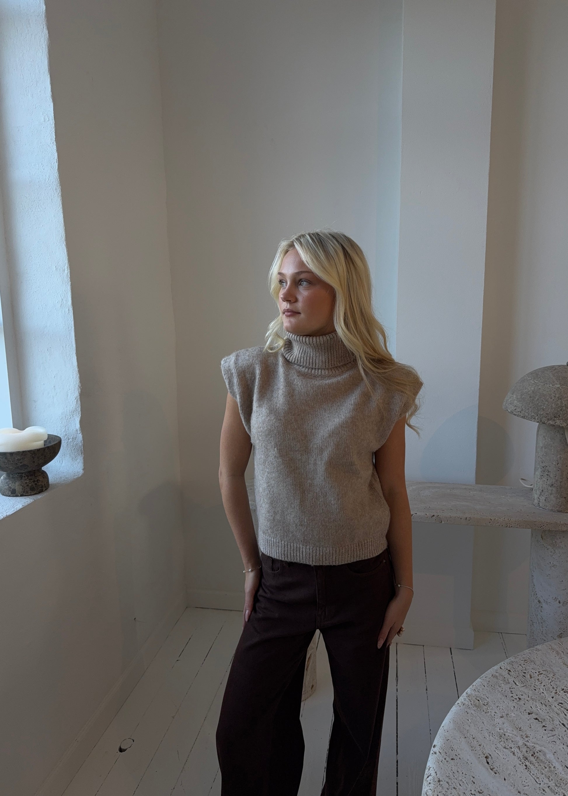 Vores fine STRIK VEST med rullekrave. Vesten kan både styles med en skjorte indenunder eller med bare ærmer.