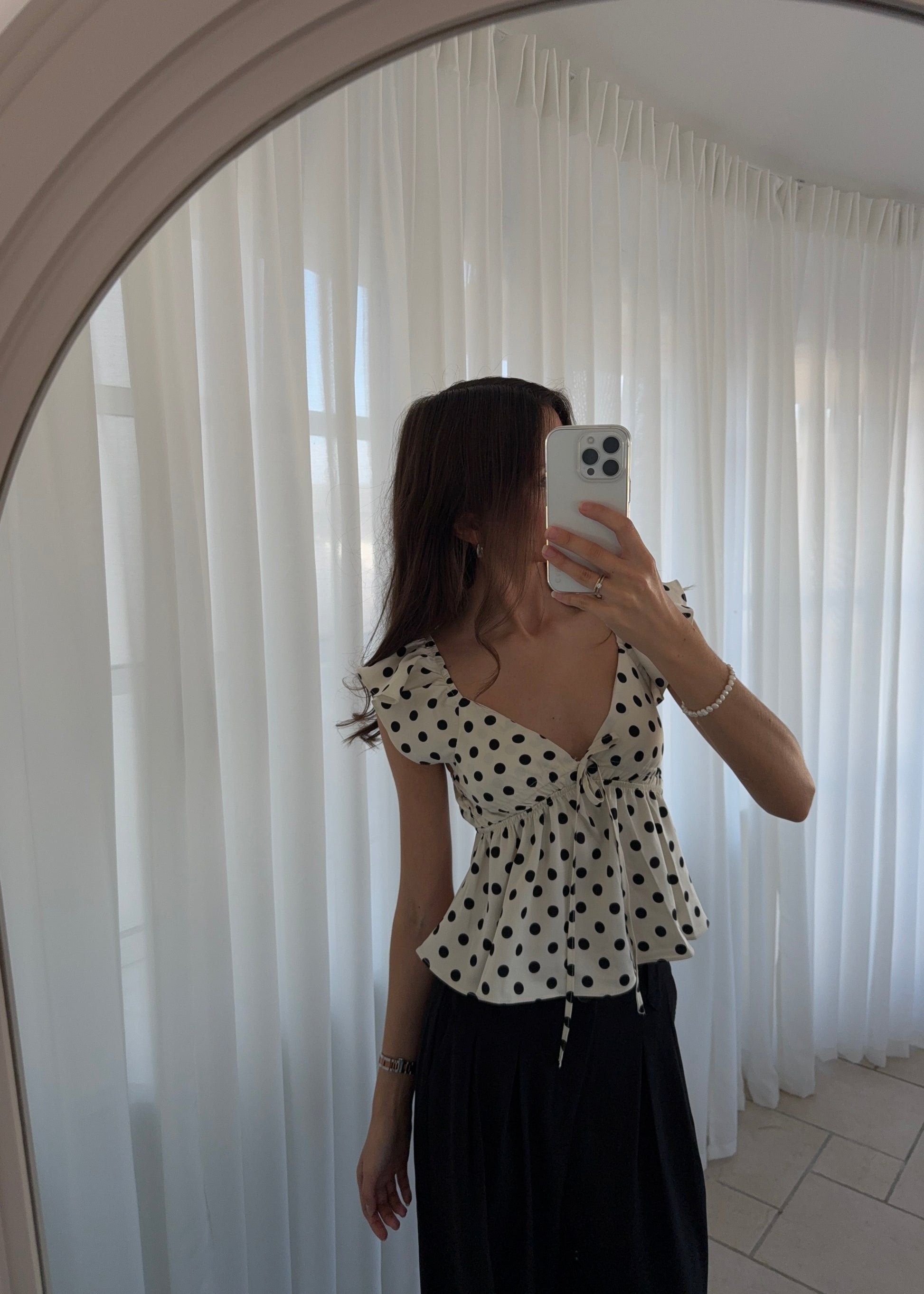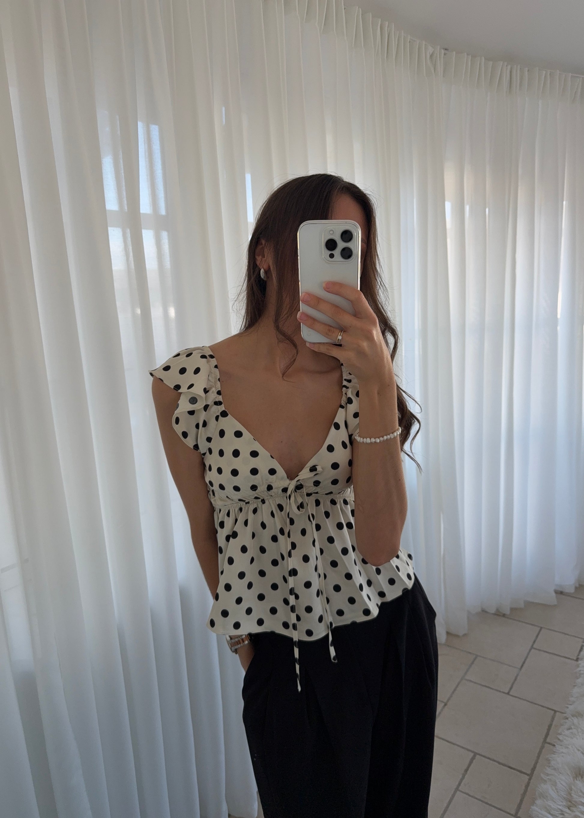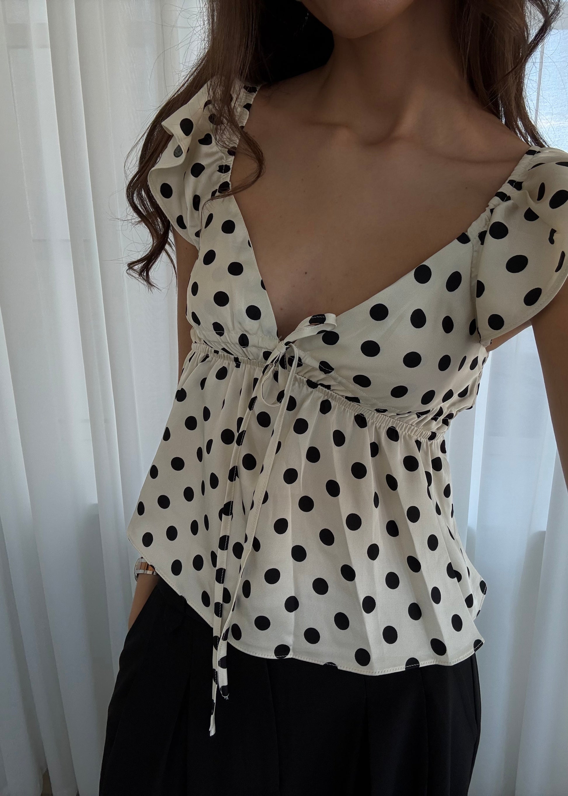 Vores smukke TUVA TOP i satin med polkaprikker. Toppen har bindebånd foran og en dyb ryg.