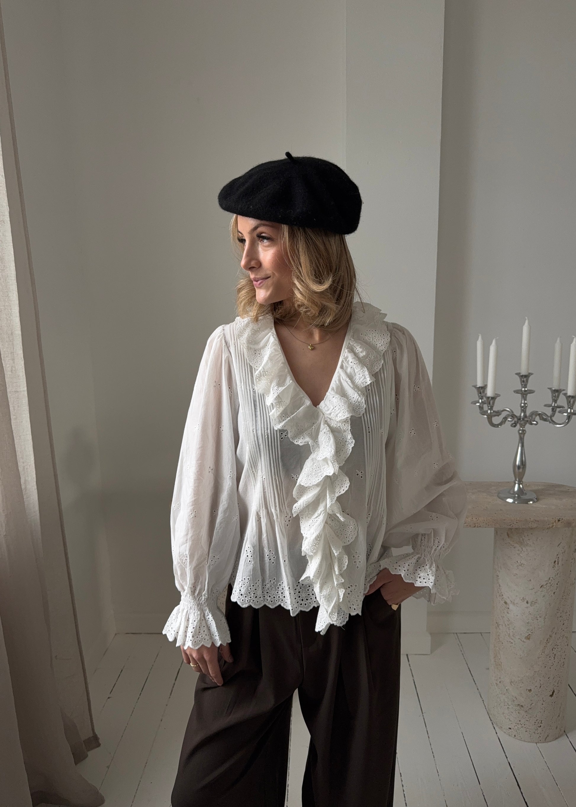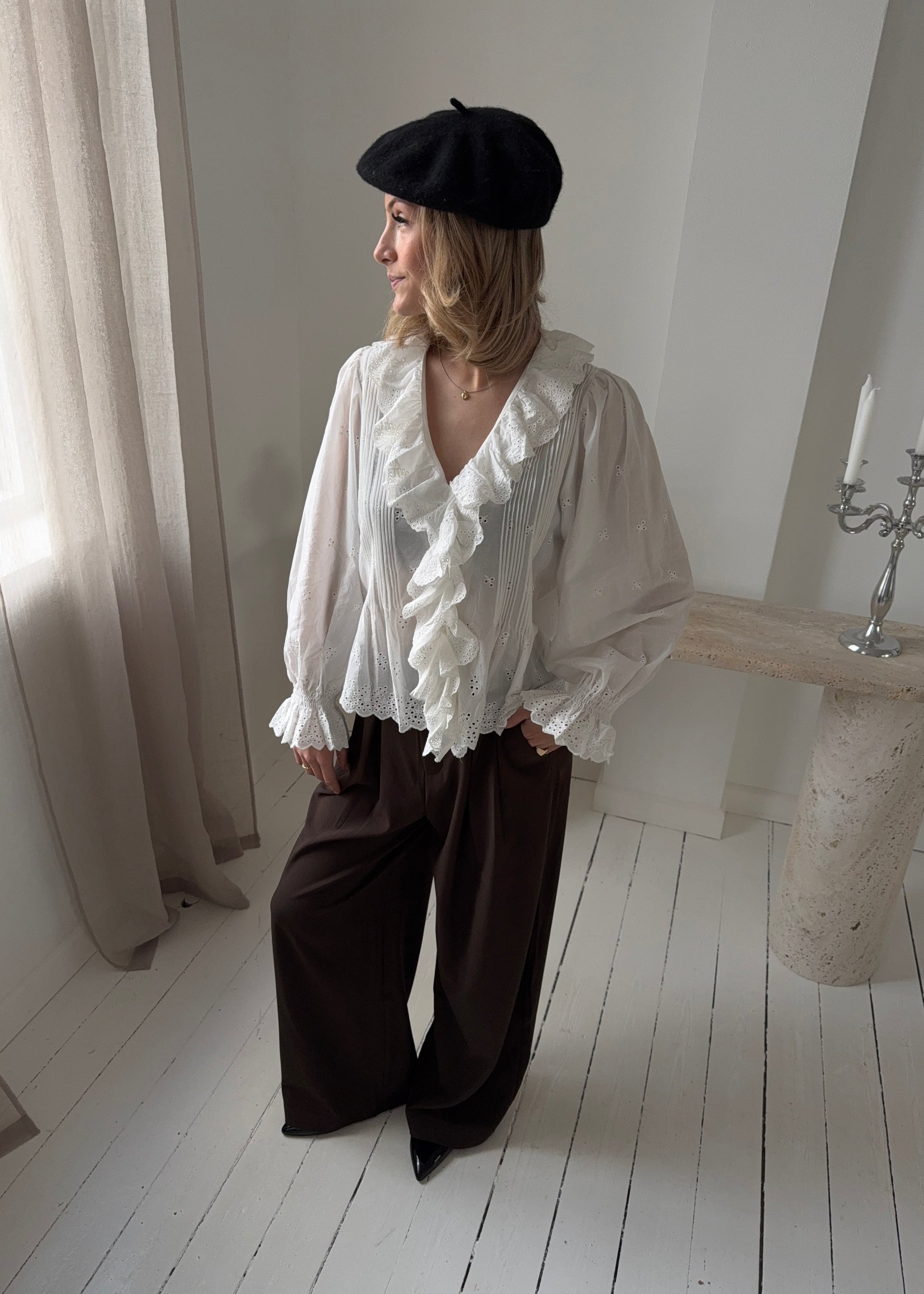 Vores fine VANESSA SKJORTE med de flotte flæse detaljer. Skjorten går ned i V-udskæringen, og er en smule figursyet. Skjorten findes også sort.